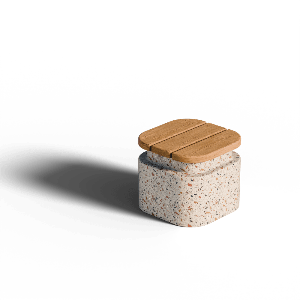 Assise en terrazzo recyclé, fabriquée à partir de terre cuite et de gravats ou sur-mesure selon votre gisement.