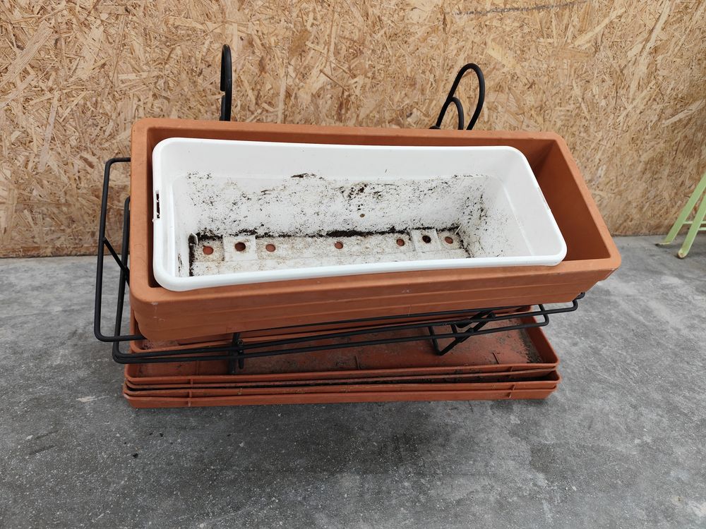 5 soucoupes, 3 supports à jardinières, 5 jardinières