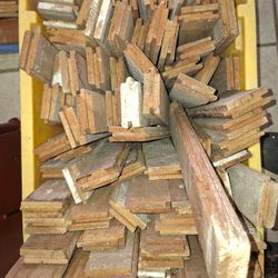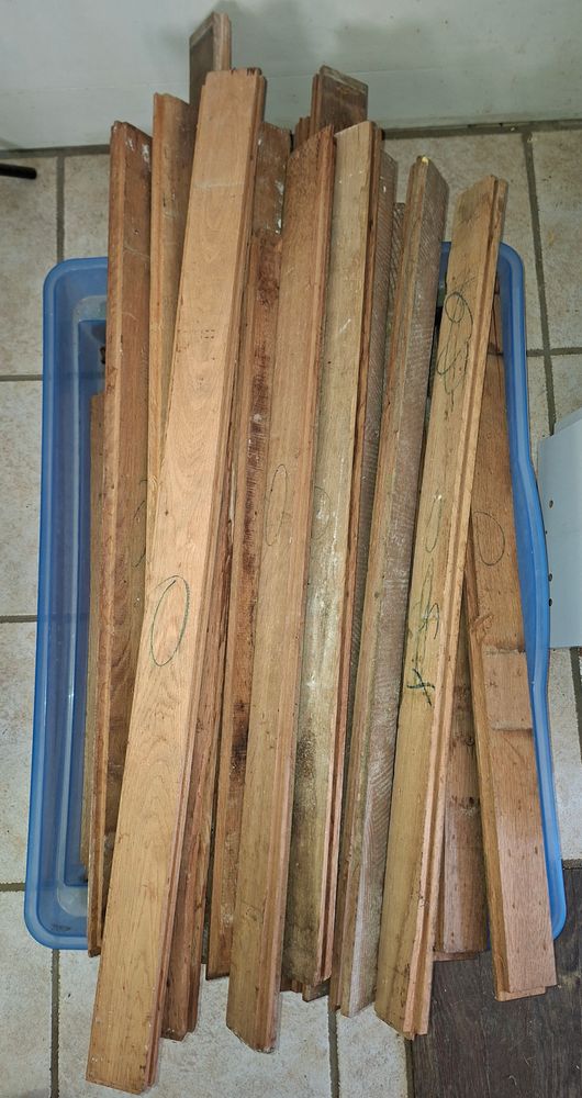 Parquet en chêne massif de 2.5 cm d'épaisseur pour environ 6.4 m² comprenant 76 morceaux de 27.5 à 42 cm; 123 morceaux de 28.5 à 52 cm et 38 morceaux de 54 à 102 cm