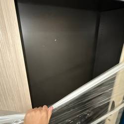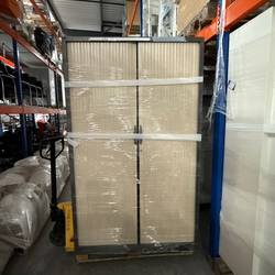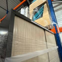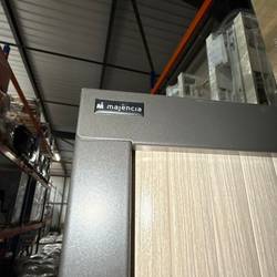 Armoire Majencia noire 200×120×45 cm, portes coulissantes finition chêne clair. Robuste et pratique, idéale pour bureaux et espaces pro.