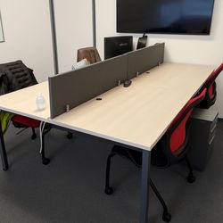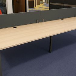 Bench : 4 places Droit, 240 x 160 cm Plateau : Peuplier Sablé + passages de câbles, goulotte Chant : angles Droits, Peuplier Sablé, épaisseur 19 mm. Piètement : Piètement Fixe, forme Arche Anthracite Prix Neuf : 1600 euros
