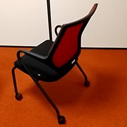 Chaise de collectivité : piètement Roulettes Noir, Dossier Maille Rouge, Assise Tissu Noir, accoudoirs fixes