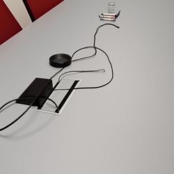 Plateau : Gris + passages de câbles, goulotte Chant : angles Droits, Gris, épaisseur 30 mm Piètement : Piètement Fixe forme Arche Noir Prix Neuf : 2000 euros