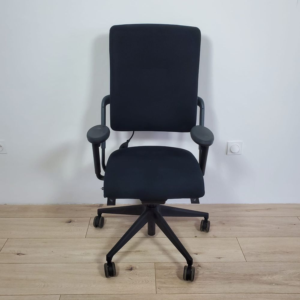Siège de bureau Assise et dossier en tissu noir rembourré Assise réglable en hauteur et en profondeur Dossier réglable en tesion Coussin gonflable pour support lomaires Accoudoirs 3D
